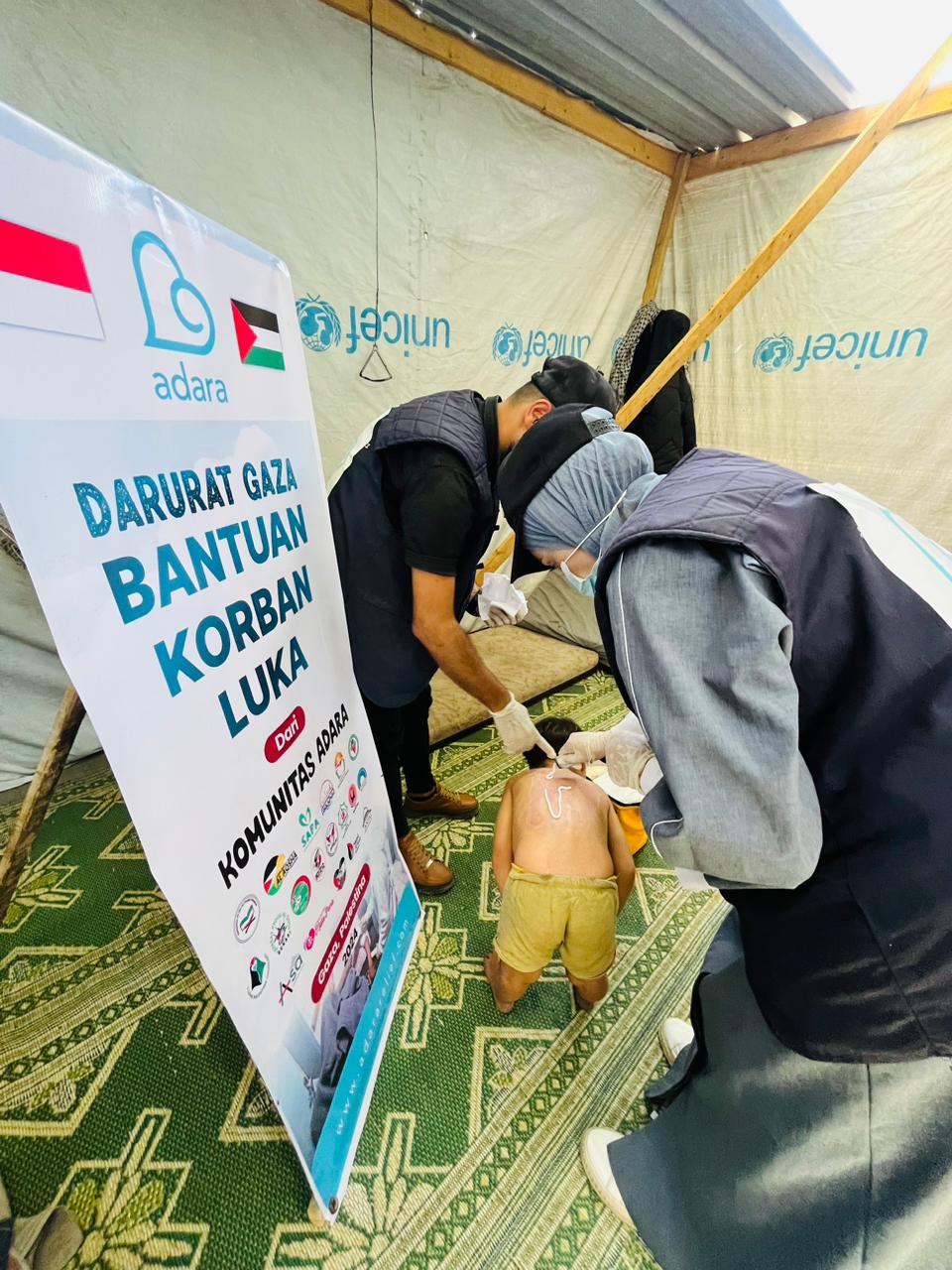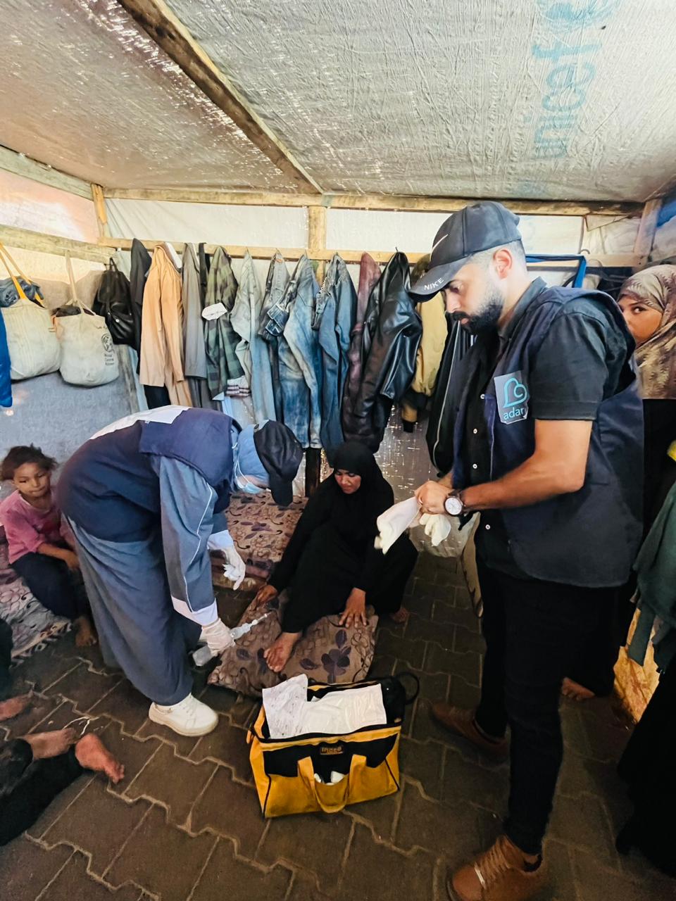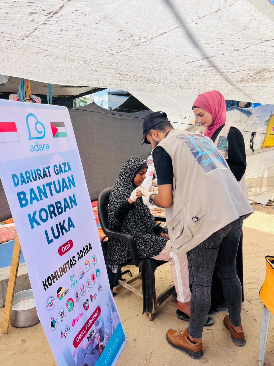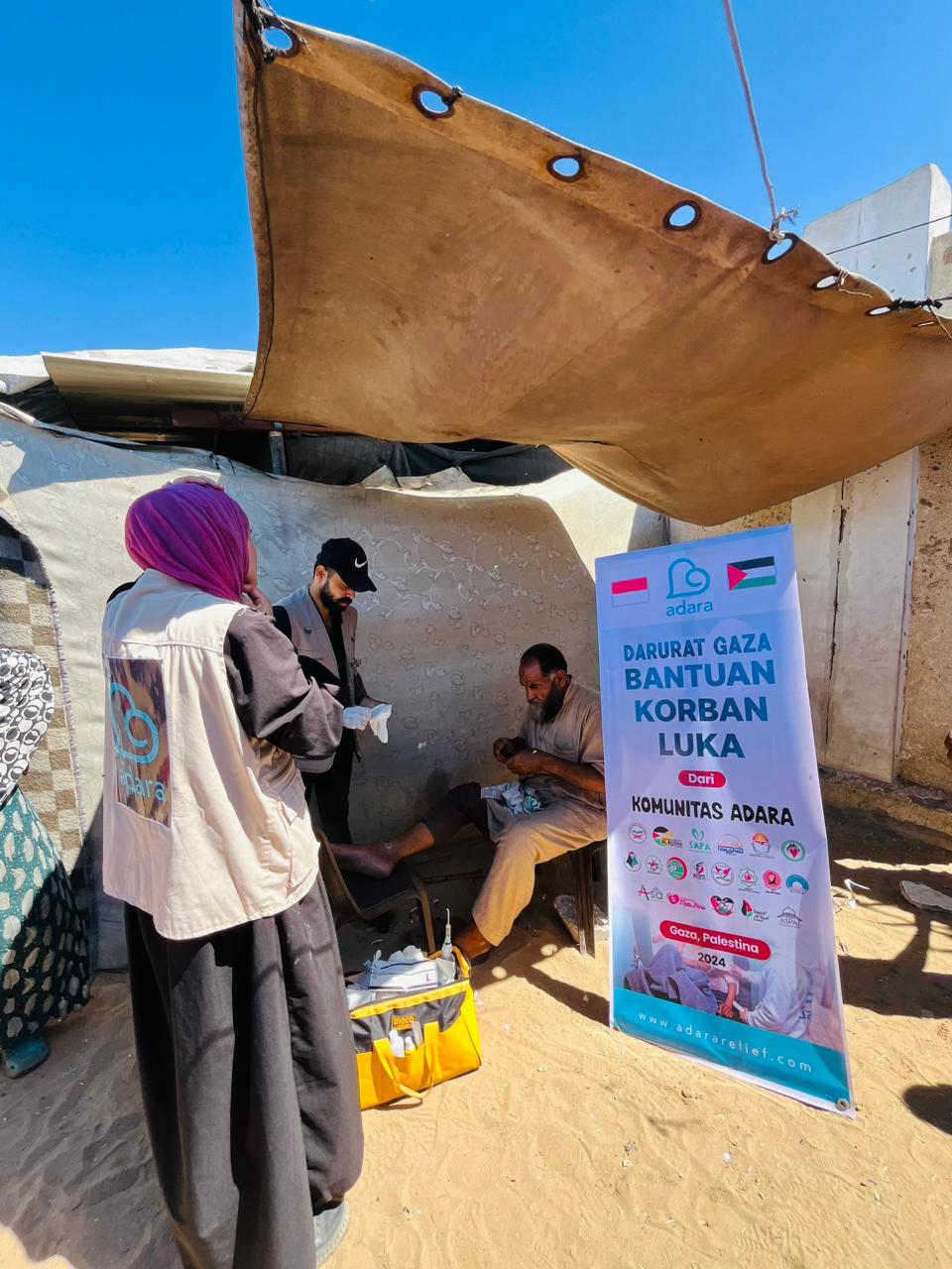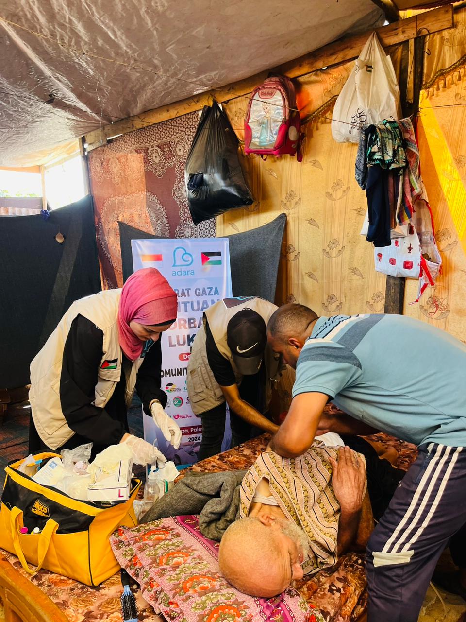 Tim medis Adara datang langsung ke lokasi menyambangi para korban luka di tenda-tenda mereka yang terletak di sekitar Universitas Al Aqsa di wilayah Al Mawasi, Khan Younis, Gaza Selatan.