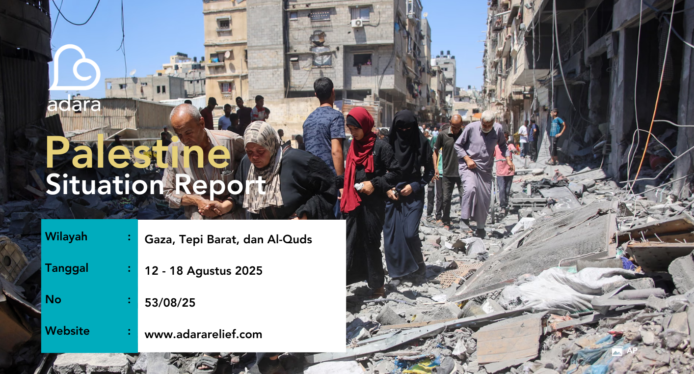 Laporan ini diterbitkan setiap pekan sebagai bagian dari komitmen Adara Relief dalam menyediakan informasi yang terpercaya dan tepat waktu, untuk mendukung respons kemanusiaan yang efektif, terkoordinasi, dan berbasis pada kebutuhan nyata masyarakat Palestina.