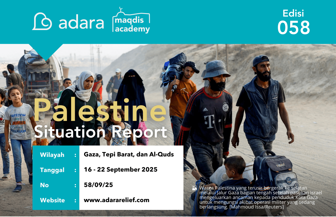 Edisi 16 – 22 September 2025 merupakan edisi ke-58 dari laporan situasi pekanan Palestina yang menghimpun data dan informasi langsung dari Gaza, Tepi Barat, dan Al-Quds, guna memberikan gambaran menyeluruh atas kondisi di lapangan.