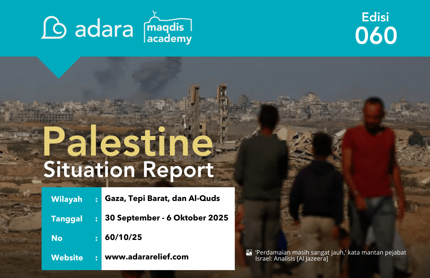 Edisi 30 September — 6 Oktober 2025 merupakan edisi ke-60 dari laporan situasi pekanan Palestina yang menghimpun data dan informasi langsung dari Gaza, Tepi Barat, dan Al-Quds, guna memberikan gambaran menyeluruh atas kondisi di lapangan.