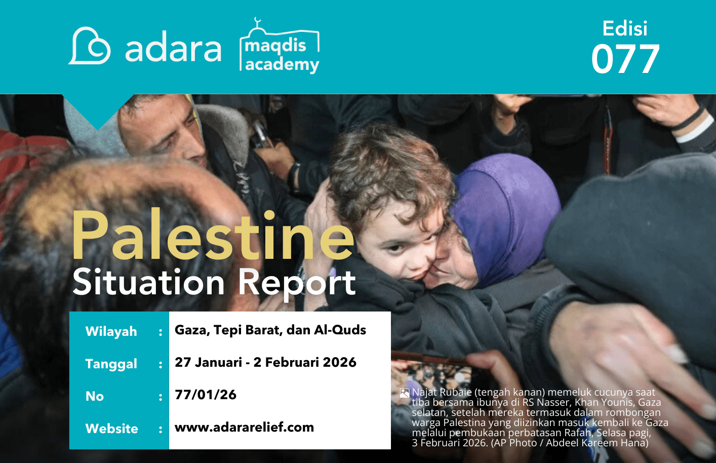 Edisi 27 Januari — 3 Februari 2026 merupakan edisi ke-77 dari laporan situasi pekanan Palestina yang menghimpun data dan informasi langsung dari Gaza, Tepi Barat, dan Al-Quds, guna memberikan gambaran menyeluruh atas kondisi di lapangan.