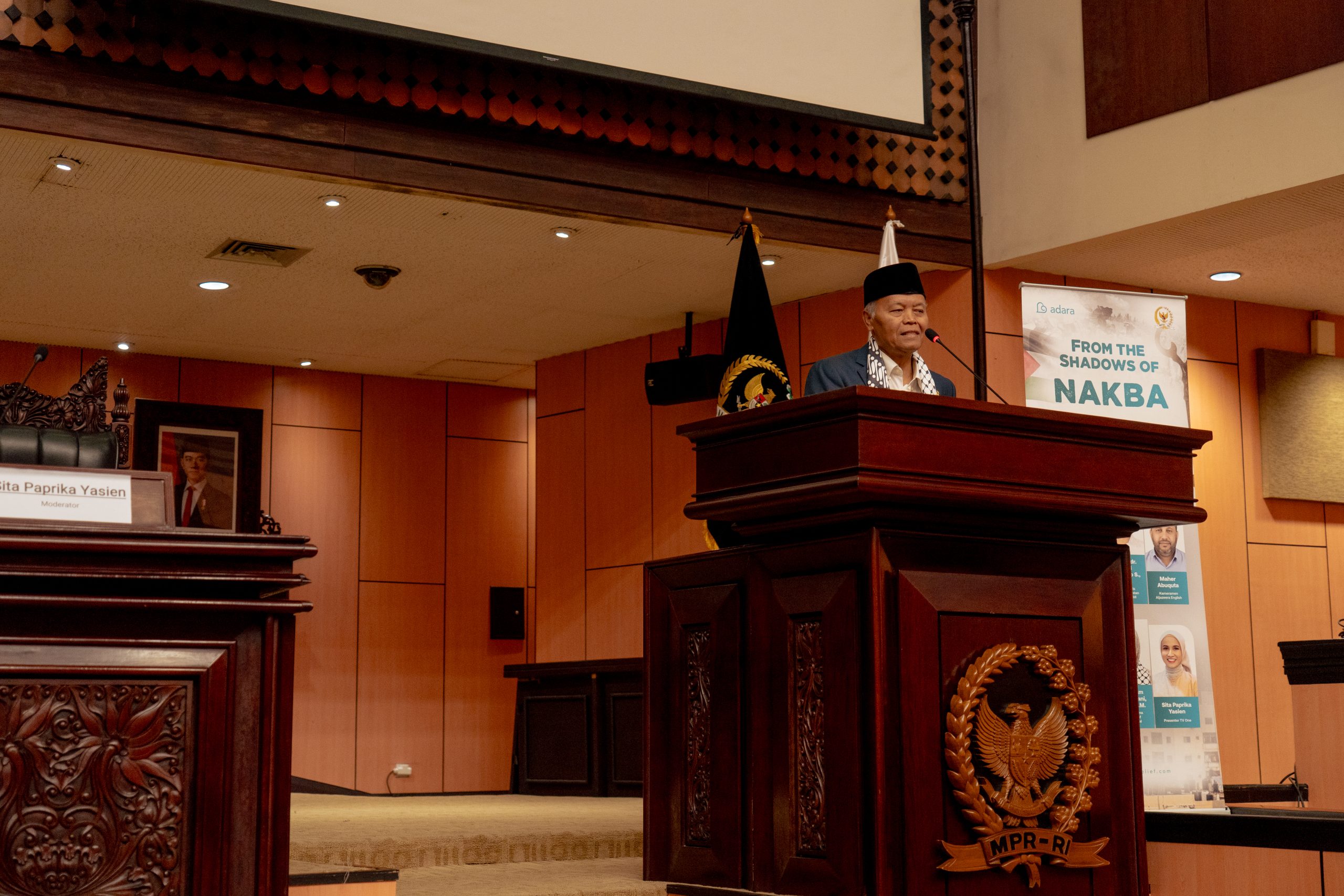 Dalam seminar ini, Adara mendatangkan Wakil Ketua Majelis Permusyawaratan Rakyat Republik Indonesia (MPR RI), Dr. H. Hidayat Nur Wahid, M.A, sebagai keynote speaker. Dalam pidatonya, sosok yang akrab dengan sapaan HNW, menegaskan, “Dalam sidang PBB, sebanyak 143 negara telah mengakui Palestina sebagai negara. Ketika Israel menyerang Palestina, ia sejatinya menyerang negara yang telah diakui oleh banyak negara berdaulat.”