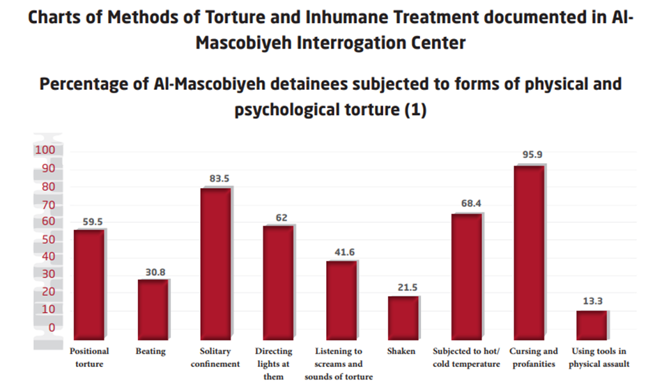 Penggunaan kekerasan yang dilakukan di Al-Maskobiya, jelas telah melanggar hukum internasional tentang perlindungan terhadap tawanan. Pelarangan penggunaan kekerasan terhadap tawanan terdapat dalam lima hukum internasional. Deklarasi Universal HAM yang terbit pada 1948 menjadi aturan awal dari larangan internasional untuk penggunaan kekerasan, kemudian Konvensi Jenewa yang terbit pada 1949 (termasuk protokol I dan II pada 1977), Konvensi melawan Kekerasan dan Perlakuan Kejam lainnya (1978), Perjanjian Internasional mengenai Hak Politik dan Sipil (1966), dan Komentar Umum HAM PBB no. 2.