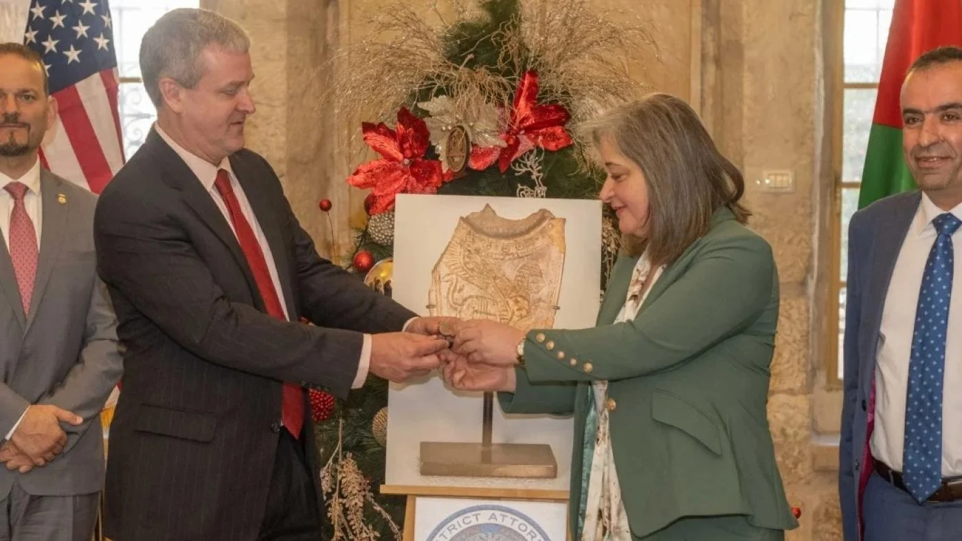 Pejabat Amerika Serikat mengembalikan artefak Palestina berusia 2.700 tahun yang dijarah kepada pemerintah Palestina dalam upacara resmi di Betlehem pada Kamis (5/1). “Sendok kosmetik”, yang diukir dari gading antara tahun 800 dan 700 SM, diserahkan kembali oleh George Noll, kepala Kantor Urusan Palestina AS, kepada menteri pariwisata dan barang antik Otoritas Palestina, Rula Maayah.