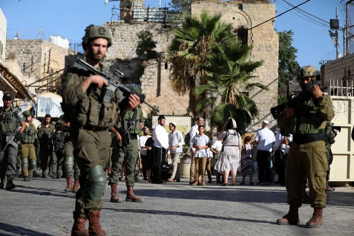 Sekelompok pemukim Yahudi di bawah perlindungan tentara Israel menyerbu kawasan Kota Tua Hebron, Tepi Barat pada 17 Agustus 2024. [Wisam Hashlamoun – Anadolu Agency]