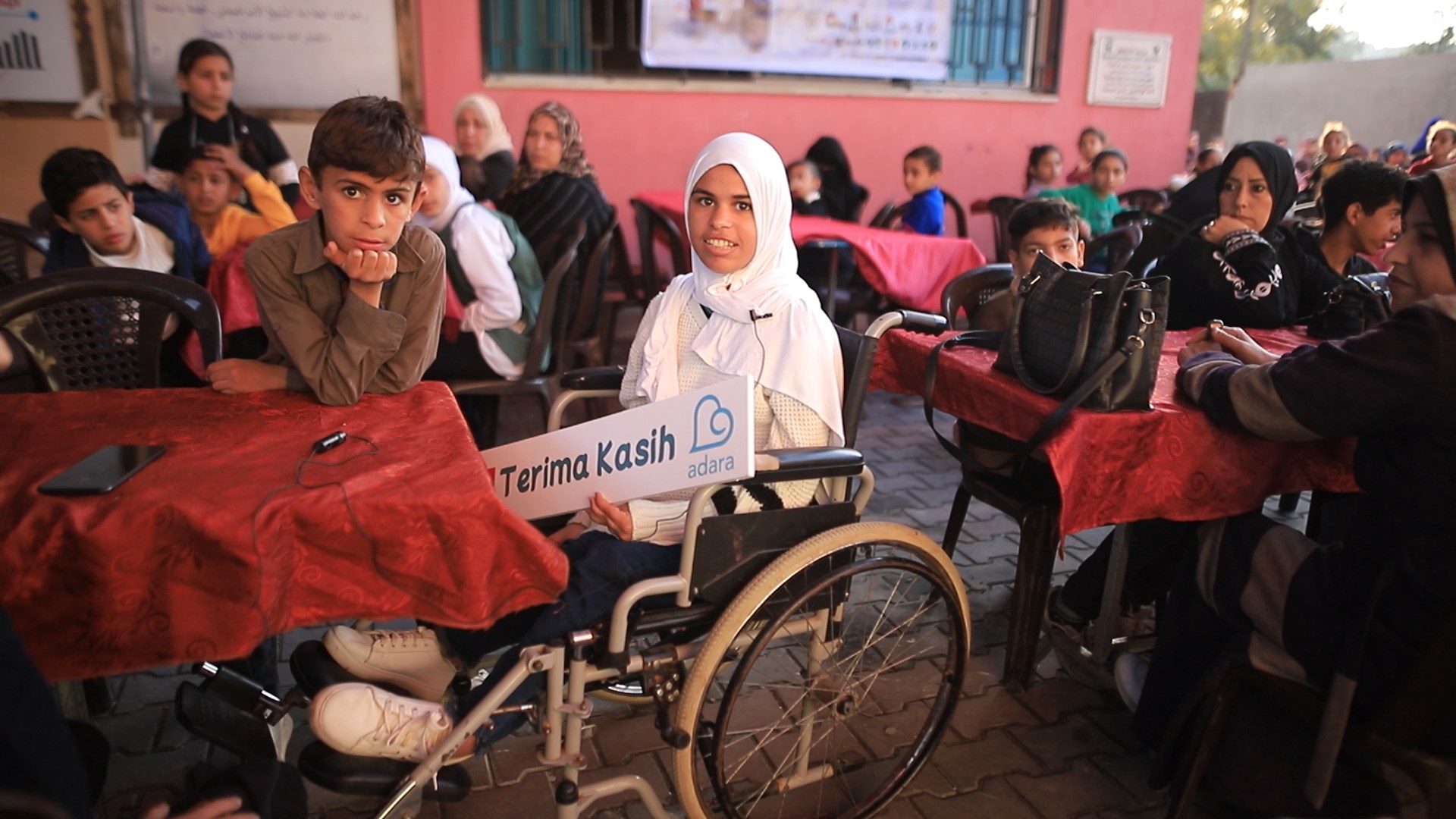 “Ini Hanin, salah satu siswa yang hadir dalam acara buka puasa. Ia seorang yatim yang kehilangan ayahnya saat agresi terakhir yang meluluhlantahkan Gaza, Hanin saat ini duduk di kursi roda karena kakinya lumpuh akibat agresi Israel. Ia senang sekali bisa berbuka puasa bersama keluarganya dan teman-temannya juga,” ujar Hasan, perwakilan mitra Adara di Gaza saat melakukan siaran langsung melalui zoom.