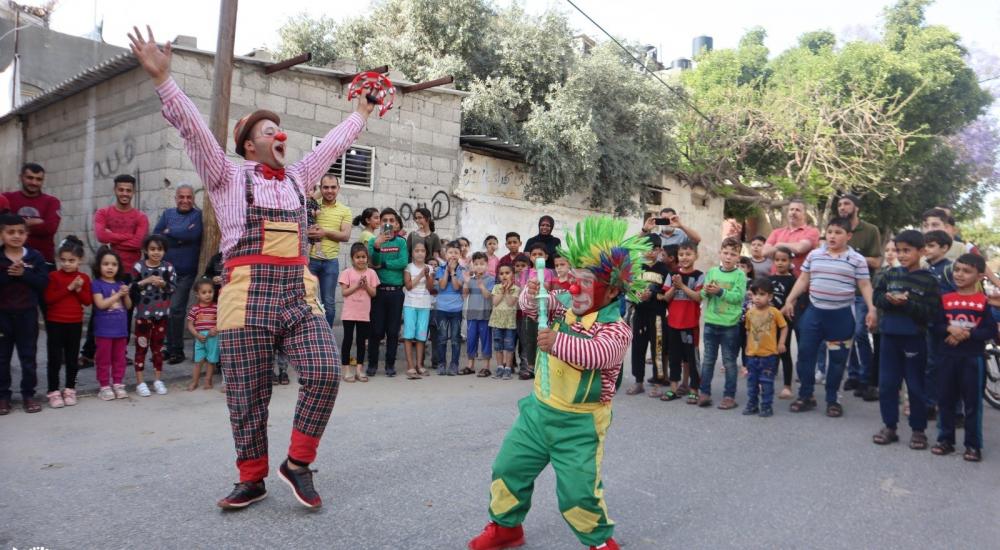 Puluhan anak berkumpul dalam lingkaran besar, sementara tim penghibur berada di tengah, berusaha menebarkan kegembiraan. Setahun berlalu setelah agresi Israel merampas kegembiraan anak-anak Jalur Gaza dan membunuh banyak dari mereka. Pakaian dengan warna-warna cerah dipakai oleh tim penghibur, tidak lupa dengan topi dan hidung badut.
