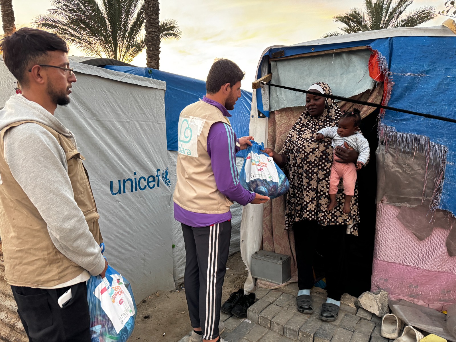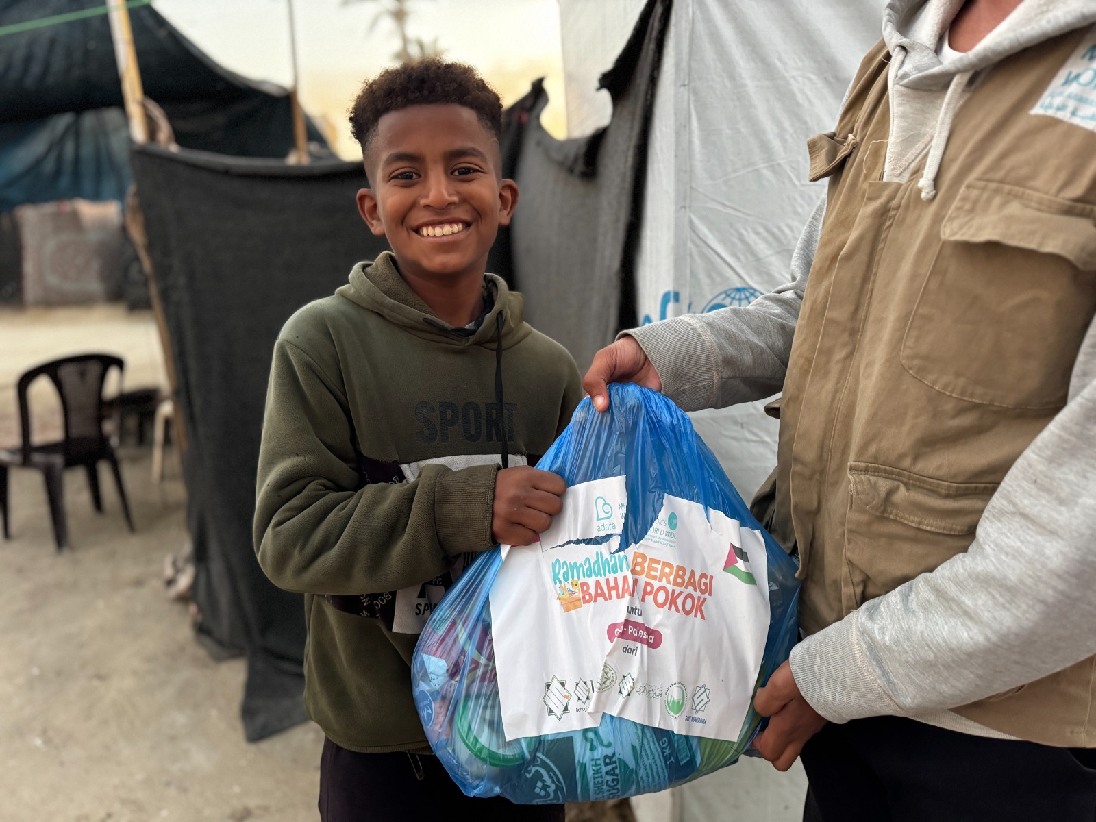 Senyum kebahagiaan terpancar dari wajah para pengungsi Gaza ketika tim Adara menyambangi tenda-tenda mereka