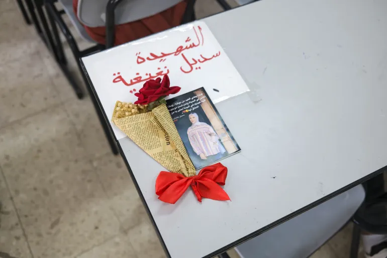 Di lantai pertama sebuah sekolah yang dikelola oleh PBB di Jenin, sekelompok anak perempuan berkumpul di satu ruangan kelas. Mereka berkumpul di sebuah meja yang terdapat mawar merah dan foto seorang anak perempuan di atasnya. Meja itu tadinya adalah milih Sadil Naghnaghieh, anak perempuan berusia 14 tahun yang tewas ditembak oleh pasukan pendudukan Israel pada awal bulan ini.