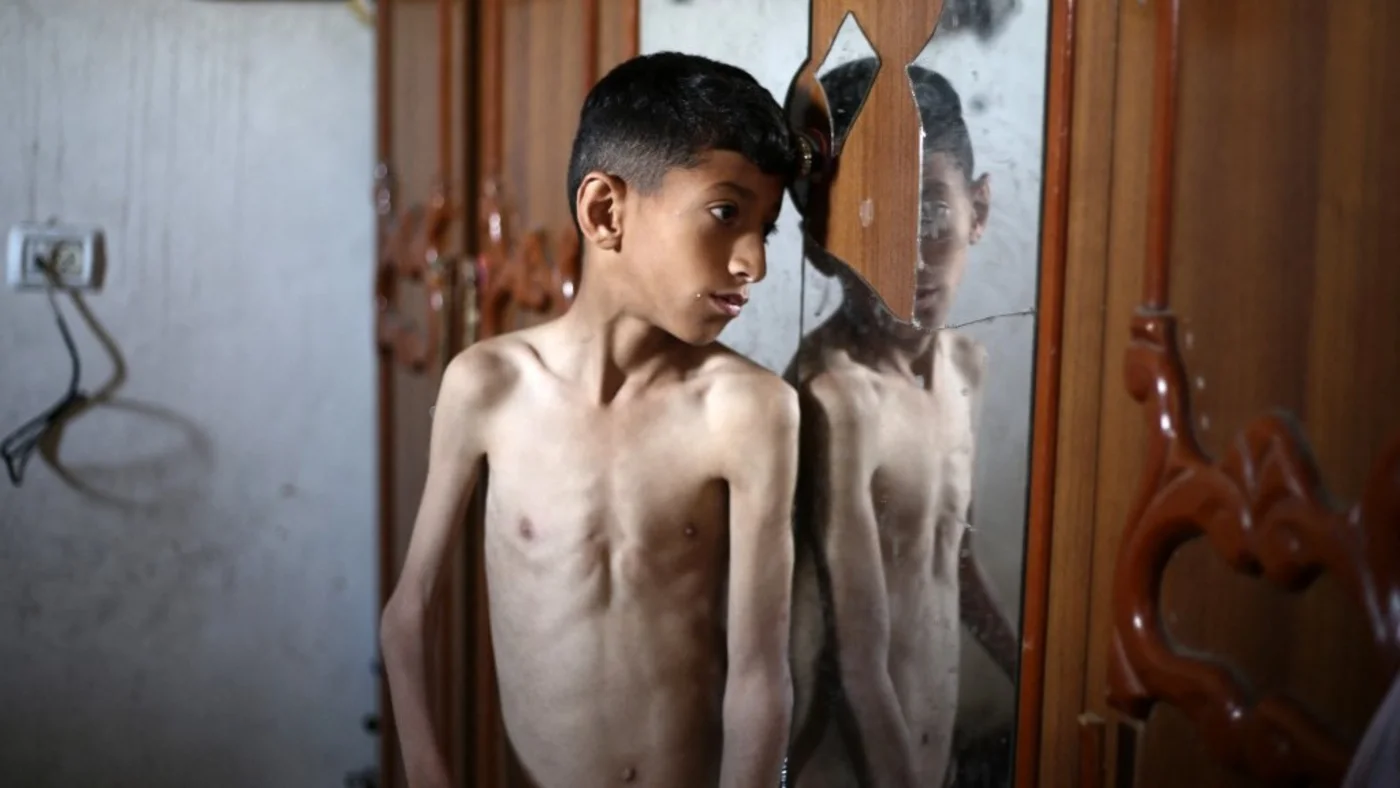 Mohammed Hanieh, seorang anak laki-laki Palestina berusia tiga belas tahun yang menurut keluarganya menderita malnutrisi, berdiri di depan cermin di rumah keluarganya di kamp pengungsi Bureij (AFP)