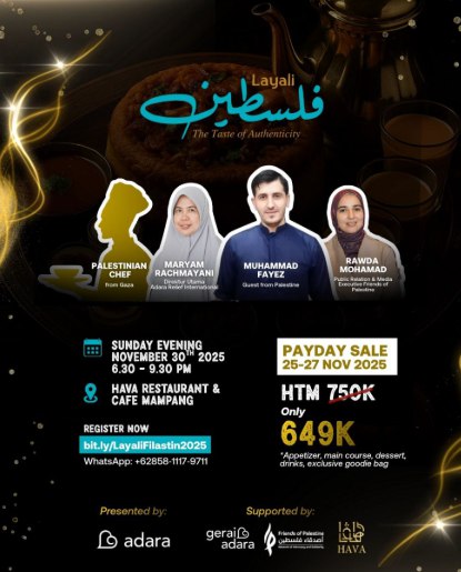 Banyak cara untuk menunjukkan rasa solidaritas terhadap Palestina, salah satunya dengan membersamai Adara dalam perjuangan. Tahun lalu, pada kesempatan Hari Solidaritas Internasional dengan Rakyat Palestina, Adara melaksanakan kegiatan “Layali Filastin” yang menampilkan pameran kebudayaan Palestina dan charity dinner. Tahun ini, Adara juga melaksanakan kegiatan yang sama, yang akan berlangsung di Al Jazeera Signature, Jakarta Pusat, pada 30 November 2025. Jika Sahabat Adara ingin berkumpul bersama teman-teman seperjuangan yang menyuarakan solidaritas terhadap Palestina, pendaftaran dapat dilakukan melalui tautan berikut: http://bit.ly/LayaliFilastin2025