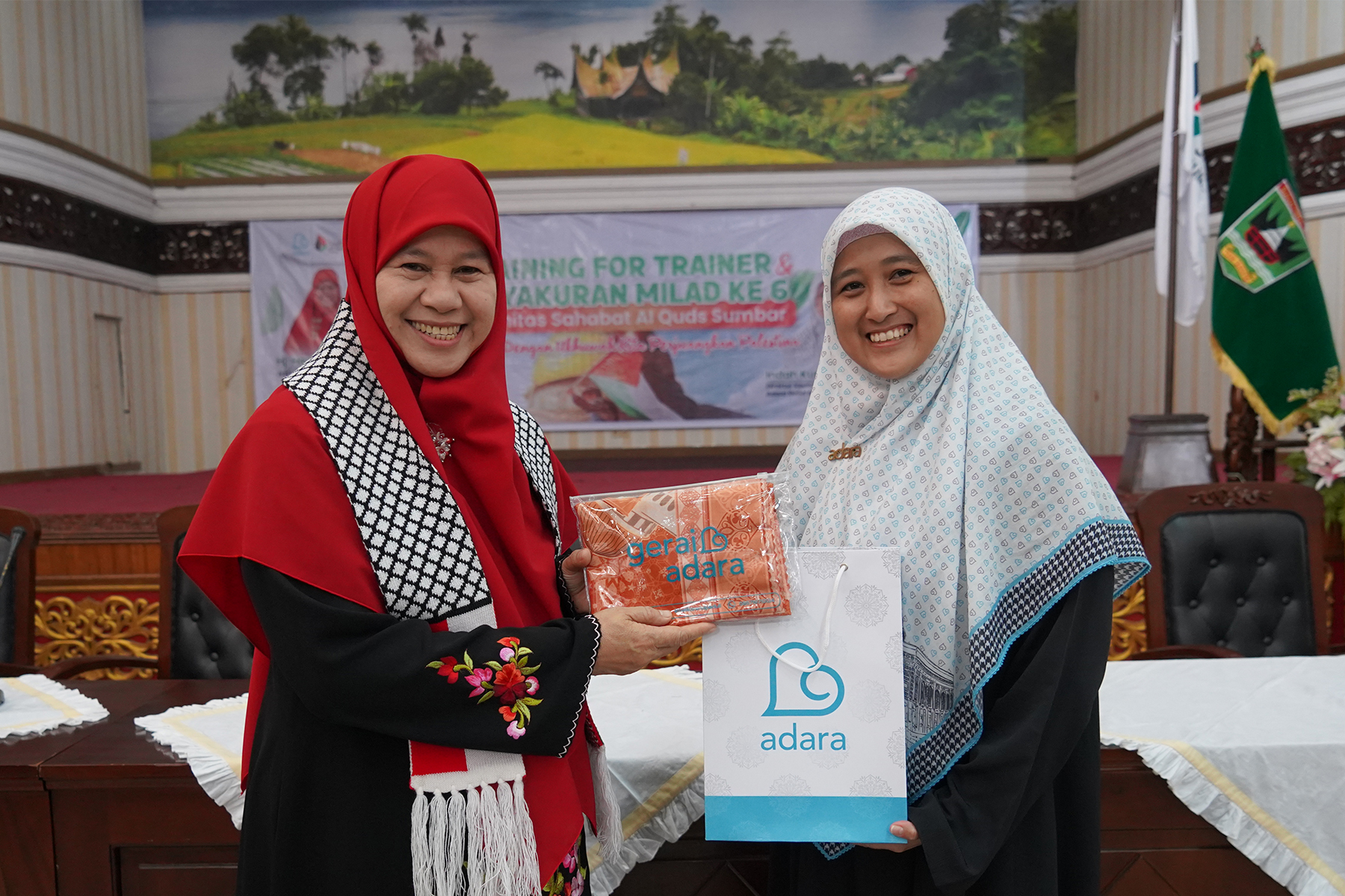 Padang — 6-7 Januari 2024, Adara Relief International bersama Komunitas Sahabat Al-Quds Sumbar (KSQ) menjalankan Training for Trainer sekaligus Tasyakur Milad Ke-6 KSQ Sumbar dengan tema “Untuk dan Dengan Ukhuwah Kita Perjuangkan Palestina”. Istri Gubernur Sumatera Barat Harneli Bahar turut hadir memberikan sambutan dan kalimat penguat.