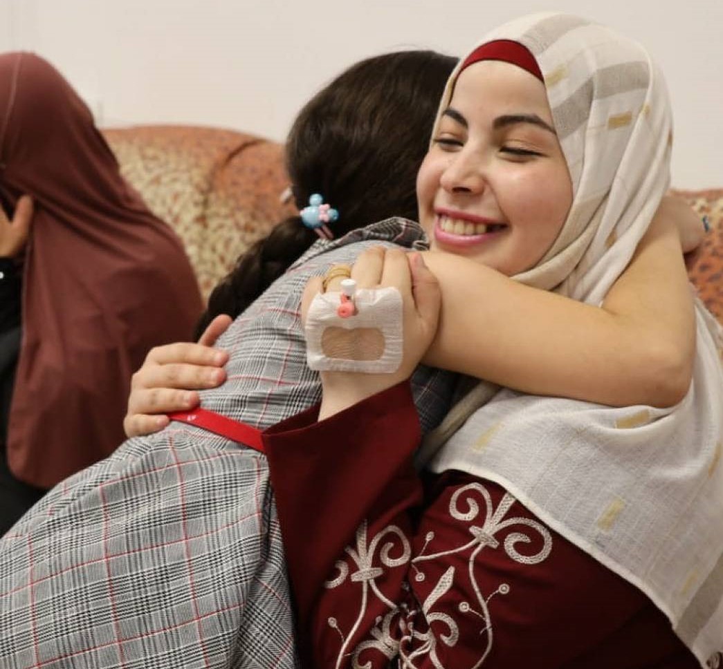 Ia memeluk putrinya yang sudah beranjak kanak-kanak, setelah ia tinggalkan dalam kondisi masih menyusui saat ditangkap tentara Israel.