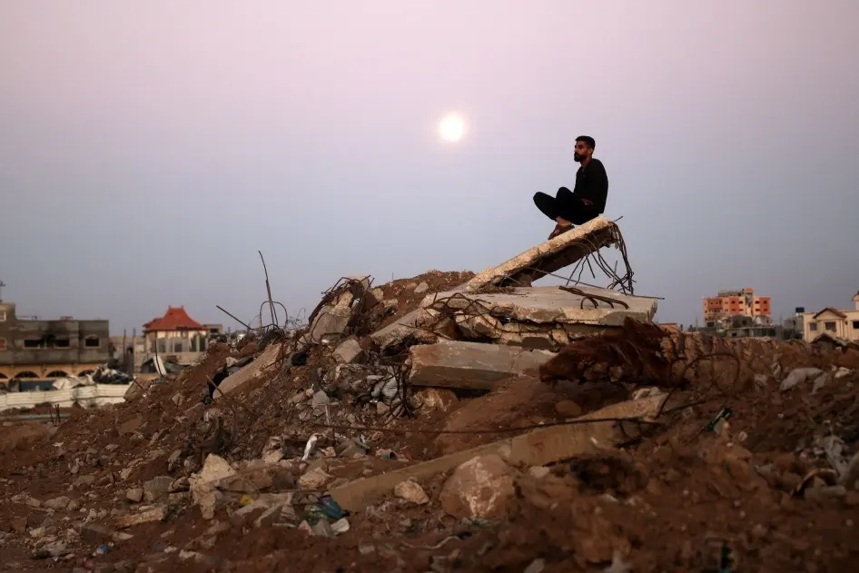 Bulan terbit saat seorang pria duduk di atas tumpukan puing di kamp pengungsi al-Bureij di Jalur Gaza tengah pada tanggal 15 November 2024, di tengah permusuhan yang sedang berlangsung di Gaza. [Eyad Baba/AFP melalui Getty Images.]