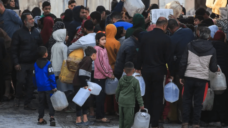 Di bawah terik matahari di Kota Gaza, kerumunan warga Palestina yang memegang wadah kosong berkumpul di sekitar truk pengangkut air. Bagi banyak lingkungan yang hancur akibat genosida Israel yang sedang berlangsung, kendaraan-kendaraan ini sekarang menjadi satu-satunya sumber air minum yang dapat mereka andalkan.