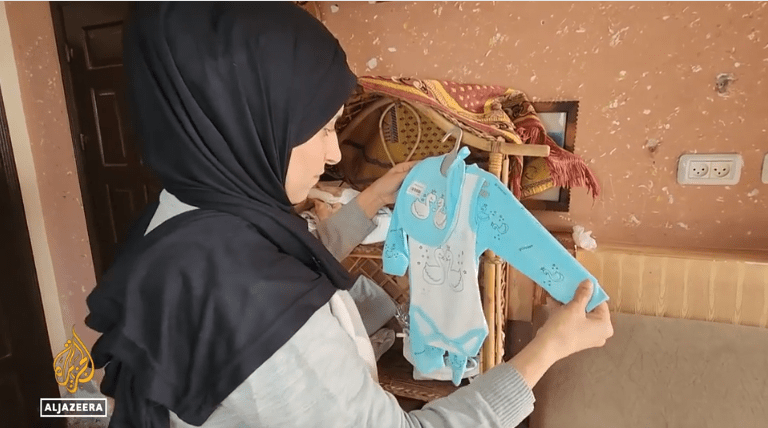Seorang perempuan Gaza, Maysera al-Kafarna, menyortir baju bayi berwarna biru yang akan ia bawa untuk anak yang seharusnya ia lahirkan. Namun, impiannya untuk menjadi seorang ibu telah pupus oleh genosida Israel di Gaza. Genosida telah menghancurkan sistem perawatan kesehatan yang menyelamatkan nyawa, serta pusat-pusat kesuburan untuk merencanakan kehamilan.