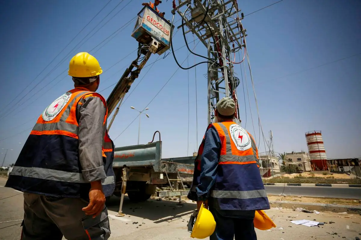 Pekerja dari Perusahaan Distribusi Listrik Gaza memperbaiki saluran listrik yang memasok air laut ke pabrik desalinasi di Deir al-Balah, Gaza pada 4 Juli 2024 [Ashraf Amra/Anadolu Agency]