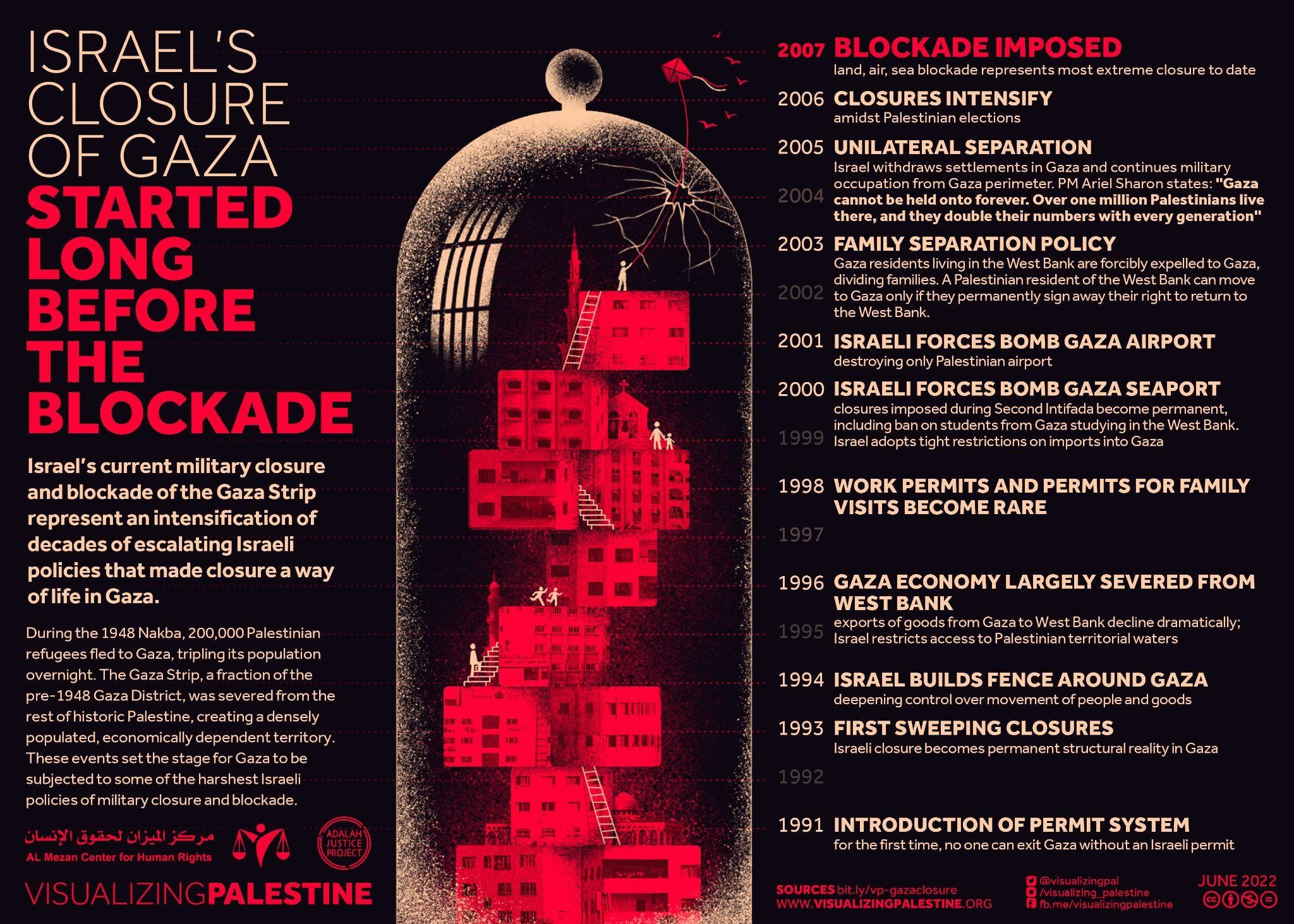 Tahun 1991 menandai pertama kalinya Israel mulai melarang warga Palestina untuk keluar dari wilayah Gaza. Sejak itu, perlahan penutupan dan blokade telah menjadi pola kehidupan di Gaza. Pada 1994, Israel mulai membangun pagar elektronik dan dinding beton di sekitar Jalur Gaza.