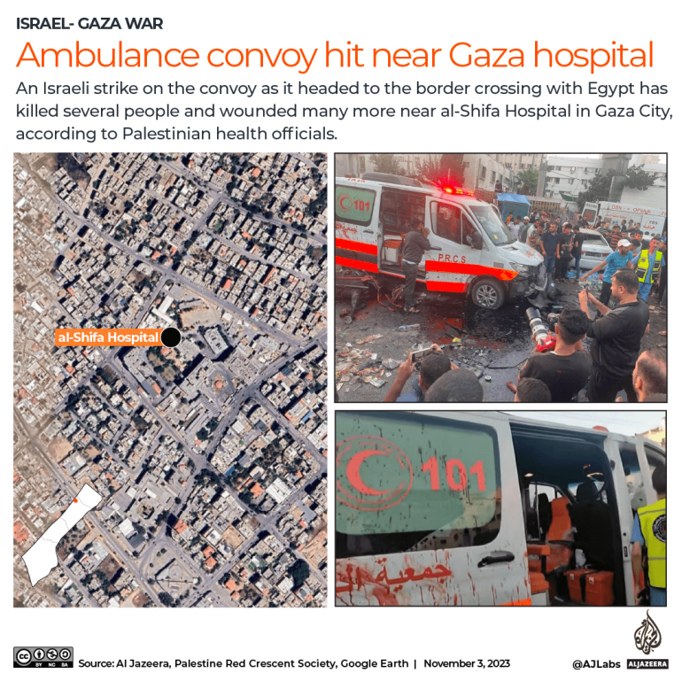 “Kami telah memberitahu Palang Merah dan Bulan Sabit Merah, kami memberitahu seluruh dunia, bahwa para korban berada dalam antrean di ambulans tersebut,” katanya. “Ini adalah konvoi medis.” Bulan Sabit Merah Palestina menambahkan bahwa salah satu ambulansnya juga menjadi sasaran serangan di dekat al-Shifa. Juru bicara Bulan Sabit Merah Palestina Mohamed Abu Musbah mengatakan daerah tempat ambulans diserang kondisinya saat itu sangat ramai dengan warga sipil.