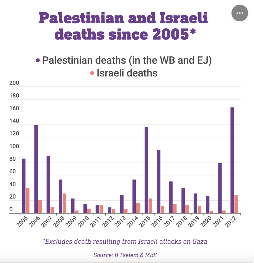 Tahun 2022, bagaimanapun, telah menjadi tahun paling mematikan di Tepi Barat, karena Israel telah membunuh lebih dari 170 warga Palestina, termasuk 53 anak-anak. Namun, tahun 2023 baru berjalan selama hampir tiga bulan, saat jumlah warga Palestina yang dibunuh oleh pasukan Israel mencapai 88 orang, termasuk 16 anak-anak dan seorang perempuan tua.