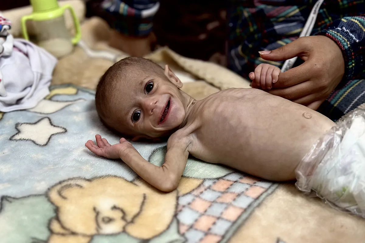 Suwar Ashur yang berusia 5 bulan, salah satu dari ratusan anak yang didiagnosis menderita malnutrisi, dirawat di Rumah Sakit Nasser di Khan Yunis, Gaza pada 1 Mei 2025. [Doaa Albaz – Anadolu Agency]