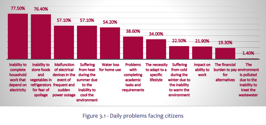 Dengan kondisi ini, sulit dibayangkan bagaimana kondisi warga Gaza yang dalam keadaan terbatas, terus mengalami kesulitan dalam mengakses listrik untuk kebutuhan hidup sehari-hari. Mereka sering mengeluhkan tidak dapat menjalani rutinitas harian yang bergantung listrik di segala aktivitas, mulai dari mengangkut dan menyimpan makanan, bekerja, pendidikan, kesehatan, dan komunikasi. Bahan makanan dan sayuran menjadi busuk dan terbuang karena tidak bisa disimpan di lemari pendingin. Kerusakan alat elektronik juga terjadi akibat pemadaman listrik yang terus terjadi. Pada musim panas, warga Gaza menderita akibat kipas angin dan pendingin ruangan yang tidak berfungsi karena seringnya terjadi pemadaman listrik. Tabel berikut ini menggambarkan permasalahan yang dihadapi oleh penduduk Gaza akibat krisis listrik yang melanda mereka.
