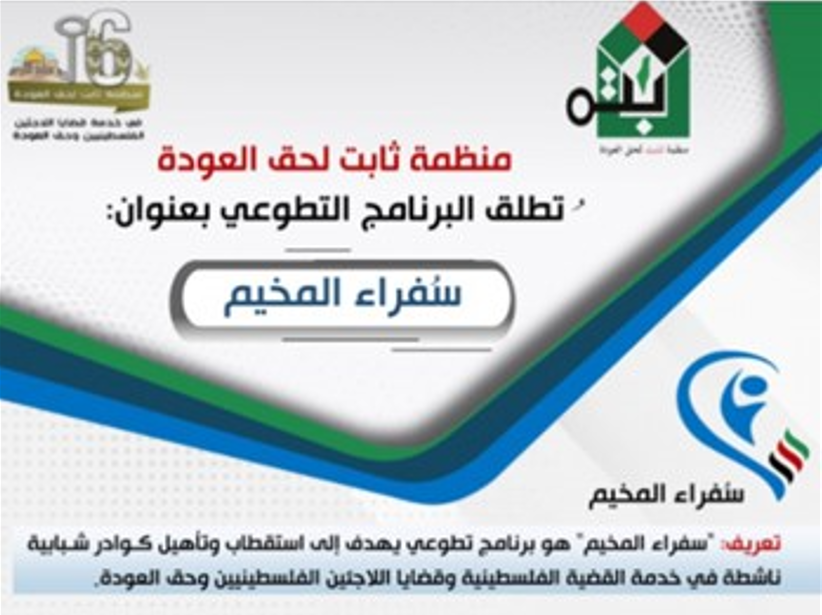 Organisasi “Tsabit li Haqqi ‘Audah” di Lebanon meluncurkan program pelatihan sukarela bertajuk “Duta Besar Kamp”, dengan tujuan melayani masalah pengungsi Palestina. Direktur organisasi, Sami Hammoud, mengatakan dalam sebuah pernyataan eksklusif kepada Kantor Berita Safa pada Kamis (5/1) bahwa program relawan berusaha untuk menarik dan memenuhi syarat kader pemuda aktif dalam melayani perjuangan Palestina, masalah pengungsi Palestina, dan hak mereka untuk kembali.
