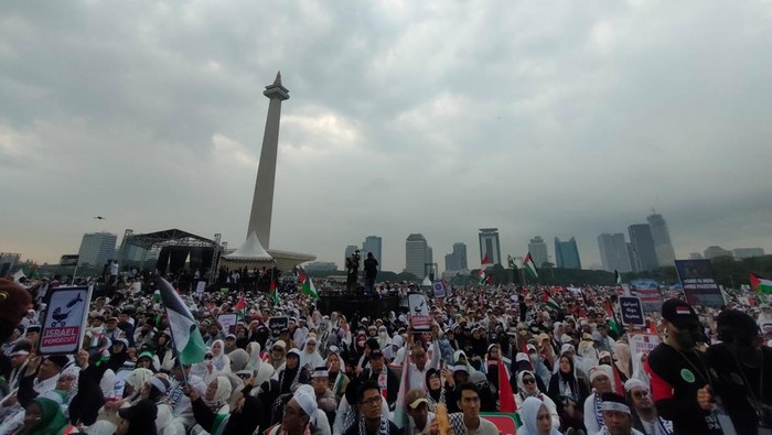 Di Jakarta, jutaan masyarakat memadati lapangan Monumen Nasional (Monas) untuk mengikuti Aksi Akbar Aliansi Rakyat Indonesia Bela Palestina pada Ahad (5/11). Sebagian besar mereka membawa bendera, syal, dan juga baju berlambangkan Palestina hingga poster kecaman atas keganasan serangan Israel yang berdampak pada rakyat sipil Palestina.