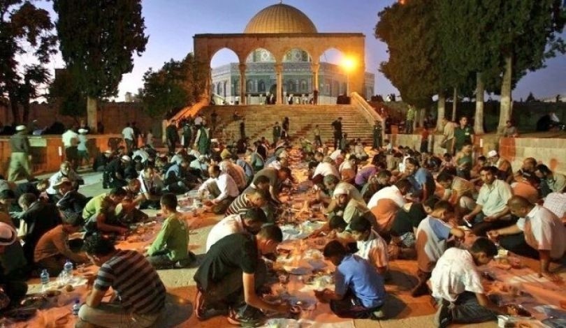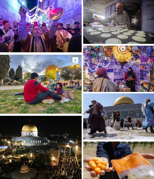 Ramadan di Palestina disambut dengan gembira. Orang-orang menyalakan lentera dan melakukan parade dengan menggunakan kostum tradisional. Qatayef, qamaruddin, dan hidangan lainnya menemani iftar. Warga Palestina juga berduyun-duyun datang ke Al-Aqsa untuk membersihkan masjid, berbuka puasa, itikaf, dan beribadah (dari berbagai sumber)