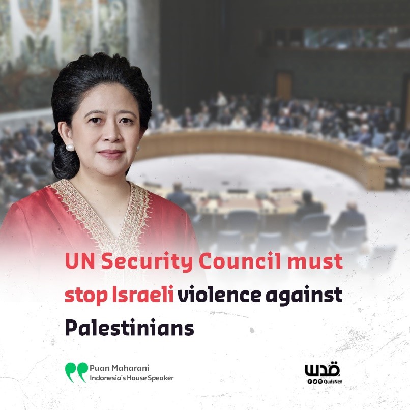 Ketua DPR RI Puan Maharani meminta pemerintah Indonesia mendesak Dewan Keamanan Perserikatan Bangsa-Bangsa (DK PBB) untuk lebih aktif menghentikan kekerasan Israel terhadap warga Palestina. “Pemerintah harus terus mengambil tindakan nyata untuk membantu rakyat Palestina,” kata Maharani dalam sebuah pernyataan pada Minggu (24/4). Ia menambahkan bahwa Indonesia dapat mendorong Dewan Keamanan PBB untuk lebih aktif dalam menghentikan kekerasan di Palestina.