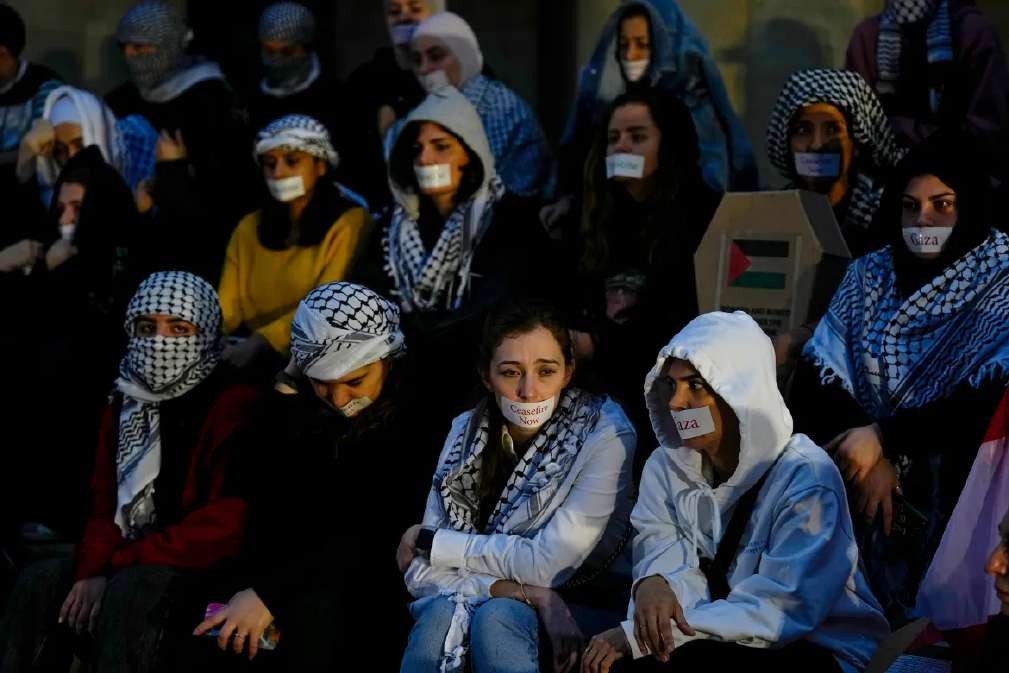 Para pengunjuk rasa turun ke jalan pada Jumat (8/12) di beberapa negara Arab untuk menunjukkan dukungan bagi Palestina yang sedang menghadapi agresi militer Israel yang terus berlanjut di Jalur Gaza yang padat penduduk. Di Lebanon, puluhan orang melakukan aksi duduk diam di dekat Kedutaan Besar Perancis di Beirut, memprotes pembunuhan warga sipil di Gaza dan menyerukan gencatan senjata. (Bilal Hussein/AP Photo)
