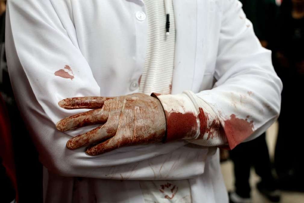 Seorang anggota staf medis yang mengenakan sarung tangan berlumuran darah berdiri di sebuah rumah sakit setelah menangani jenazah warga Palestina yang terbunuh dalam serangan Israel di Kamp Far’a (8/9), di tengah ketegangan yang meningkat di Tubas, Tepi Barat yang dijajah. (Raneen Sawafta/ Reuters)