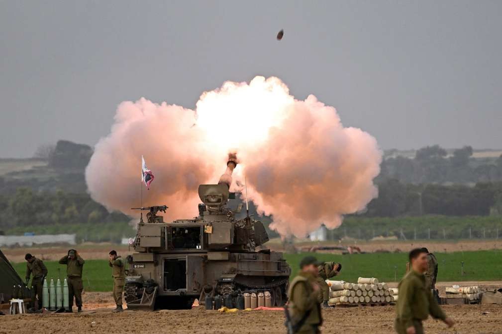 Sebuah howitzer Israel meluncurkan tembakan ke Gaza dari posisi dekat Nahal Oz (10/12). Howitzer adalah jenis senjata artileri yang digunakan untuk serangan darat dan memiliki daya rusak yang kuat. (Mostafa Alkharouf/Anadolu)