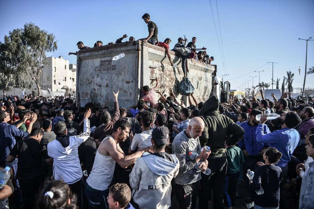 Pada Senin (11/12), warga Palestina berkerumun di sekitar truk yang mendistribusikan air kemasan di Rafah, Gaza. (Stringer/Anadolu)