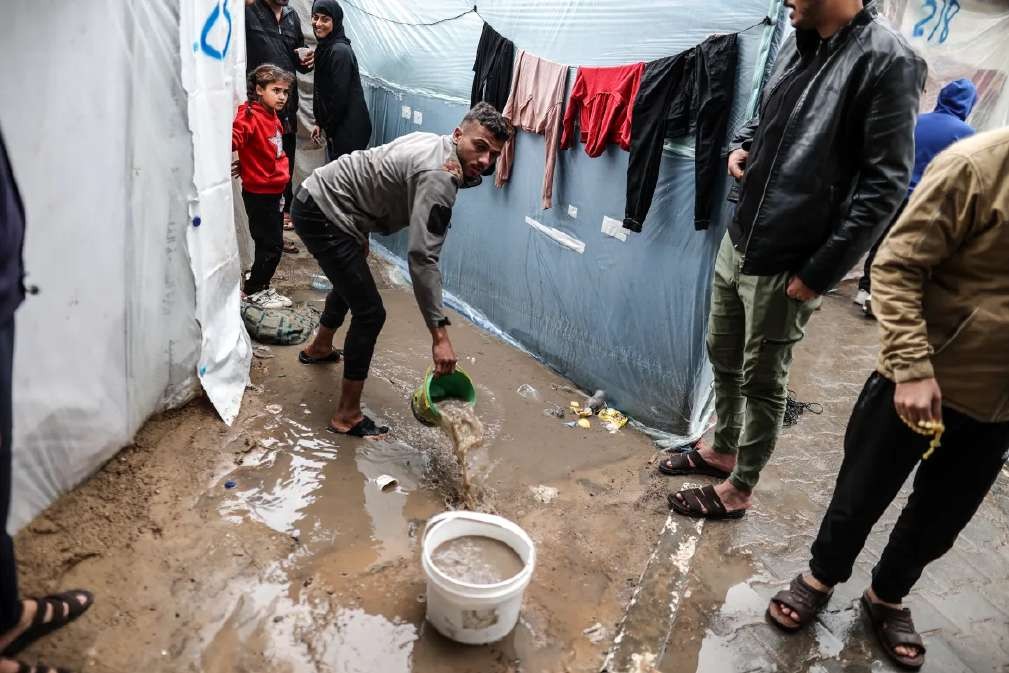 Angin kencang, hujan deras, dan banjir menerpa para pengungsi yang tinggal di tenda-tenda di Rafah, selatan Gaza (13/12). Hal ini menambah kekhawatiran akan penyebaran penyakit di tempat penampungan yang penuh sesak dan tidak memiliki fasilitas pembuangan limbah yang memadai. Kementerian Kesehatan wilayah Palestina melaporkan lebih dari 360.000 kasus infeksi telah ditemukan di antara 1,9 juta orang yang mengungsi akibat serangan militer Israel. (Ali Jadallah/ Anadolu/ Al Jazeera)