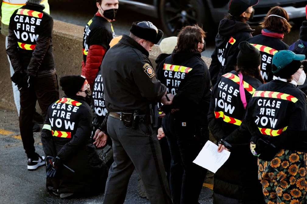 Para pengunjuk rasa dari kelompok nasional Suara Yahudi untuk Perdamaian (Jewish Voice for Peace) pada Jumat (15/12) ditangkap saat menyerukan gencatan senjata di Gaza selama demonstrasi di seluruh AS pada malam ke-8 Hanukkah, di Philadelphia, Pennsylvania. (Hannah Beier/ Reuters)