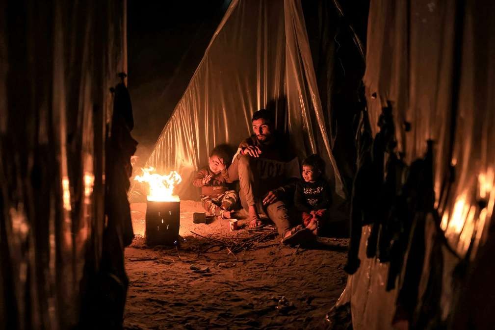 Seorang pria duduk bersama anak-anak di dekat api unggun di luar salah satu tenda yang menampung pengungsi Palestina, di Rafah, Gaza (18/12). Semakin banyak penduduk Gaza dari bagian utara dan tengah yang mengungsi ke selatan, mengingat intensitas serangan Israel yang tinggi dan dilakukan terus-menerus. (Mahmud Hams/AFP)