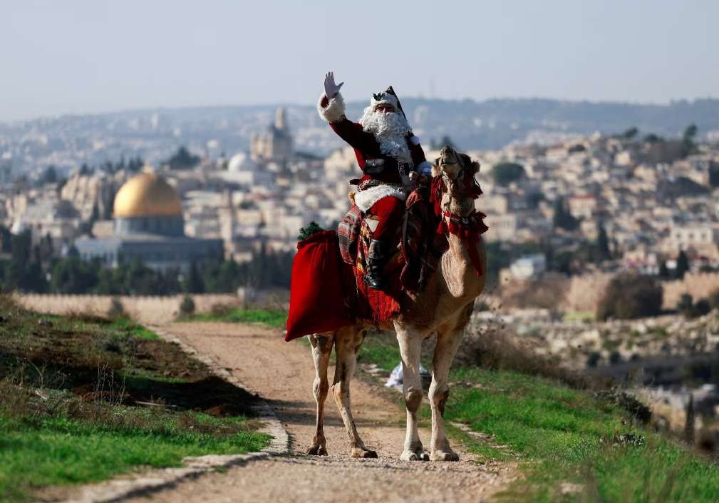 Issa Kassissieh, berpakaian seperti Sinterklas, duduk menunggangi unta saat ia mengunjungi kebun zaitun yang menghadap Masjid Kubah Batu di kompleks Al-Aqsa, di Al-Quds. (Ammar Awad/ Reuters)