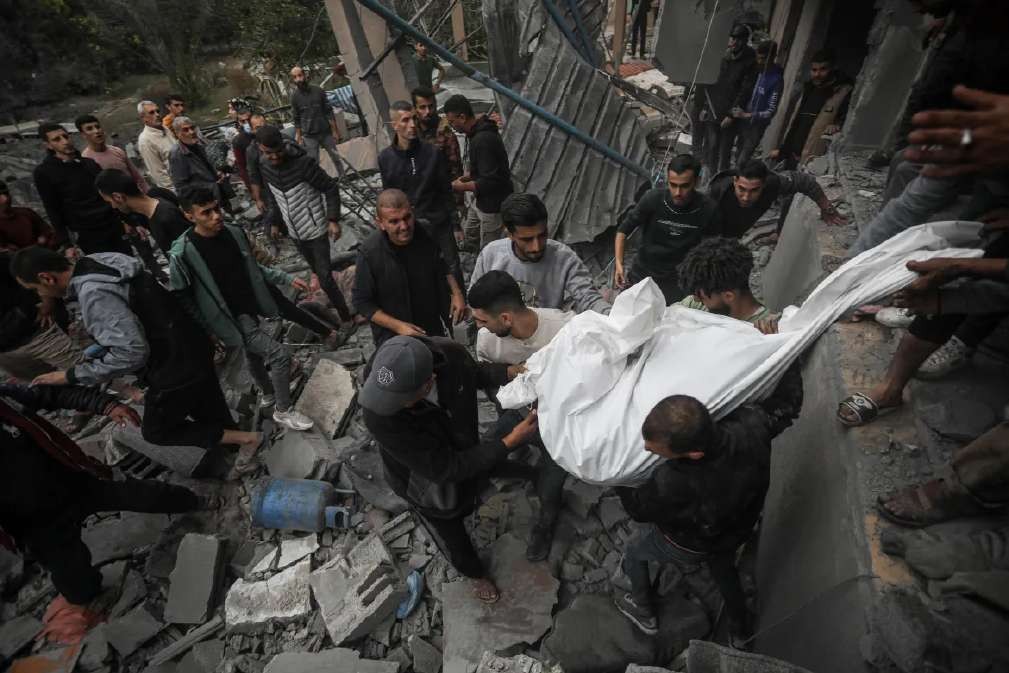 Warga Palestina berusaha menyelamatkan para penyintas dan mengambil jenazah mereka yang terbunuh dalam serangan Israel pada Selasa (5/12) di Deir Balah, yang menyasar gedung tiga lantai milik keluarga Abu Musbih. Bom menghantam gedung tersebut ketika sekitar 150 orang berada di dalamnya, sebagian besar dari mereka adalah keluarga pengungsi dari wilayah lain di Gaza. Menurut Kementerian Kesehatan Gaza, 45 orang terbunuh dan sedikitnya 50 lainnya luka-luka. Beberapa korban tewas masih terkubur di bawah reruntuhan. (Abdul Hakim Abu Rish/Al Jazeera)