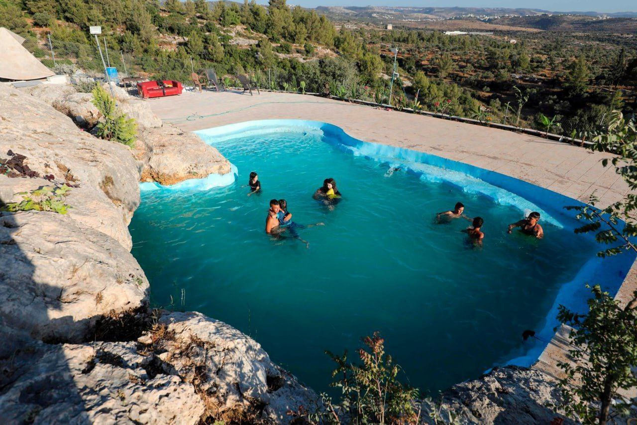 Beberapa orang sedang menikmati musim panas dengan berenang di Kota Ni’lin, Ramallah (17/7). Kolam renang ini dulunya adalah sebuah gua seluas 5000 m2. Mohammed al-Khatib bersama keluarganya, sebagai pemilik tanah, membutuhkan waktu empat bulan untuk mengubah gua menjadi kolam renang tersebut. (Xinhua, QNN)