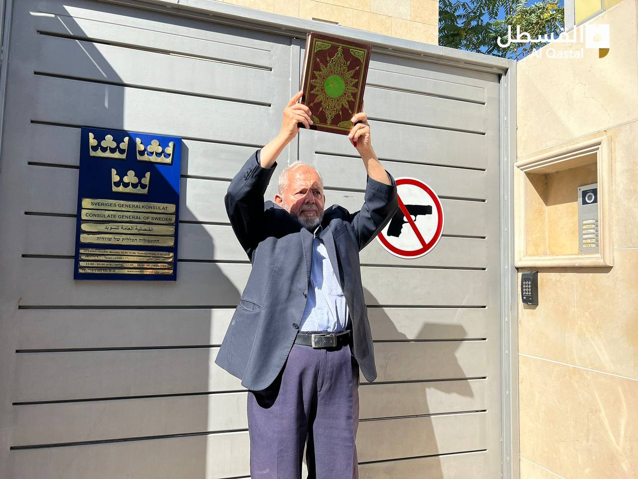 Warga Palestina menggelar protes di luar Konsulat Jenderal Swedia di Al-Quds (Yerusalem) yang diduduki (3/7), mengutuk Swedia yang mengeluarkan izin untuk membakar salinan Al-Qur’an di Stockholm. (Al-Qastal)