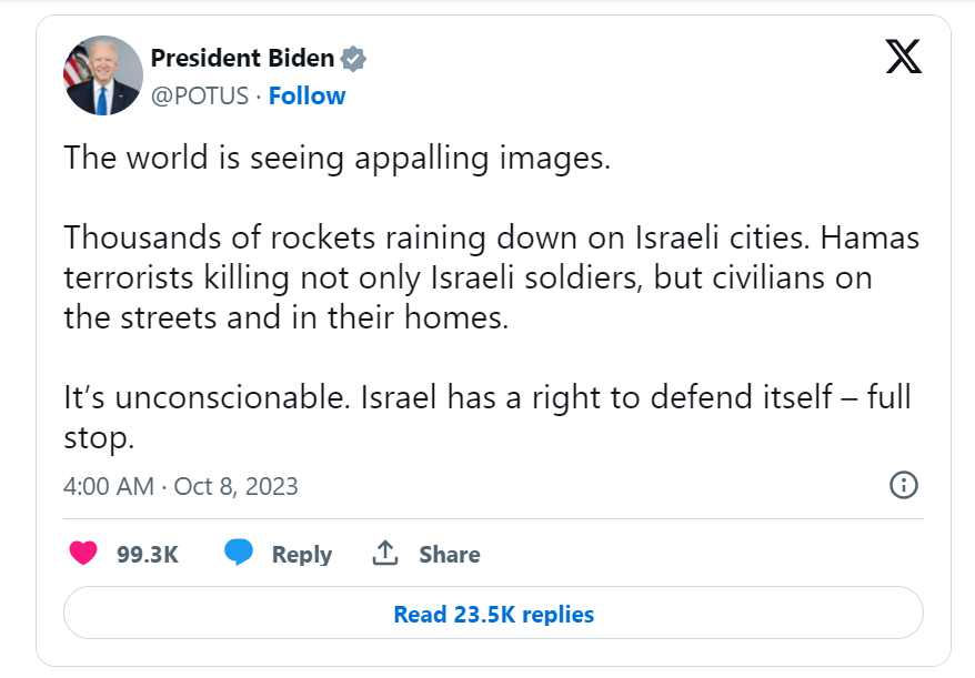Pada hari ini, kita melihat betapa hipokritnya dunia pada Palestina. Baru sepuluh hari Israel melakukan agresi ke Gaza, tetapi lebih dari 3.300 penduduk Gaza telah wafat, mayoritas dari mereka adalah anak dan perempuan. Dalam 6 hari pertama, terhitung 6000 rudal yang telah diluncurkan dan meluluhlantakkan kota Gaza. Jumlah ini setara dengan rudal yang ditembakkan AS ketika menginvasi Afghanistan dalam kurun waktu satu tahun. Namun tetap saja, hanya sedikit simpati yang disuarakan untuk Palestina. Dibanding melirik Palestina, Presiden AS Joe Biden justru bersimpati pada Israel dengan mengungkapkan, “Israel mempunyai hak untuk membela diri dan rakyatnya. Dukungan pemerintahan kami terhadap keamanan Israel sangat kuat dan tidak tergoyahkan.” Kuat dan tidak tergoyahkannya ini dibuktikan dengan kunjungan Biden ke Israel pada hari ke-12 agresinya, bahkan setelah sebuah rumah sakit di Gaza diluluhlantakkan Israel hingga menyebabkan terbunuhnya lebih dari 500 orang Palestina.