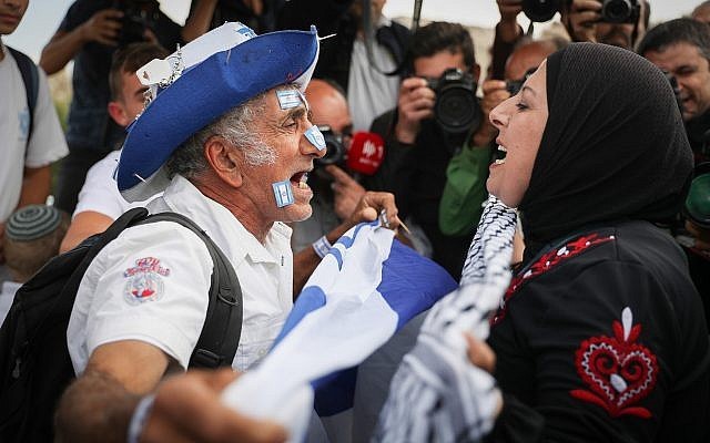 Seorang pria yang mengibarkan bendera Israel berdebat dengan seorang wanita Arab saat Hari Yerusalem pada 13 Mei 2018. (Sumber: timesofisrael.com)