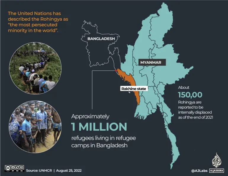 Hampir satu juta Rohingya dari Myanmar, mayoritas muslim, tinggal di fasilitas yang penuh sesak di Bangladesh. Di sana terdapat puluhan ribu orang yang melarikan diri dari negara asal mereka setelah junta militer melakukan tindakan keras dan mematikan pada 2017. Sementara di Myanmar sendiri, yang mayoritas beragama Buddha, sebagian besar Rohingya ditolak kewarganegaraannya dan dipandang sebagai imigran ilegal dari Asia Selatan.