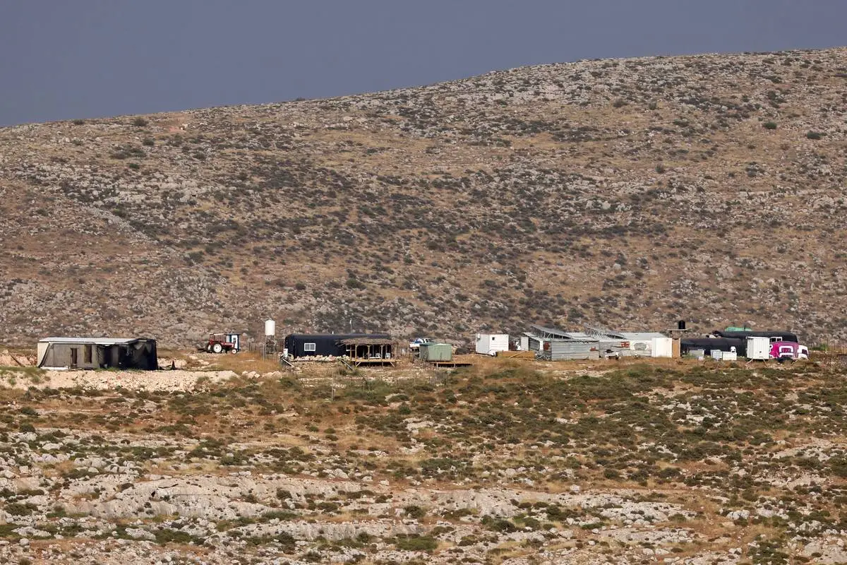Sebuah pos terdepan pemukim Israel berdiri di puncak bukit dekat desa Palestina Deir Jarir, sebelah timur kota Ramallah di Tepi Barat yang diduduki pada tanggal 25 April 2024. [Foto oleh ZAIN JAAFAR/AFP via Getty Images]