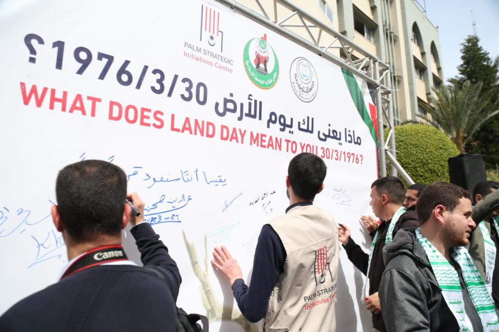 Puluhan pemuda Palestina menandatangani spanduk yang membuktikan hak Palestina atas tanah yang dirampas. Hal Ini dilakukan selama stand yang diselenggarakan oleh Pusat Inisiatif Strategis “Palestina-Malaysia” untuk memperingati 46 tahun Hari Tanah Palestina di halaman Universitas Islam di Kota Gaza. Direktur Pusat Inisiatif Strategis, Ibrahim Al-Zaim, mengatakan “Rakyat Palestina, terlepas dari semua yang telah mereka lalui dalam hal pemindahan, pencurian tanah, dan penderitaan setiap hari oleh pendudukan Israel, mereka tidak pernah kehilangan hak atas tanah mereka.”