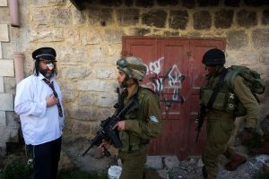 Seorang pemukim di Hebron mengenakan kostum saat Purim dengan dilindungi polisi Israel