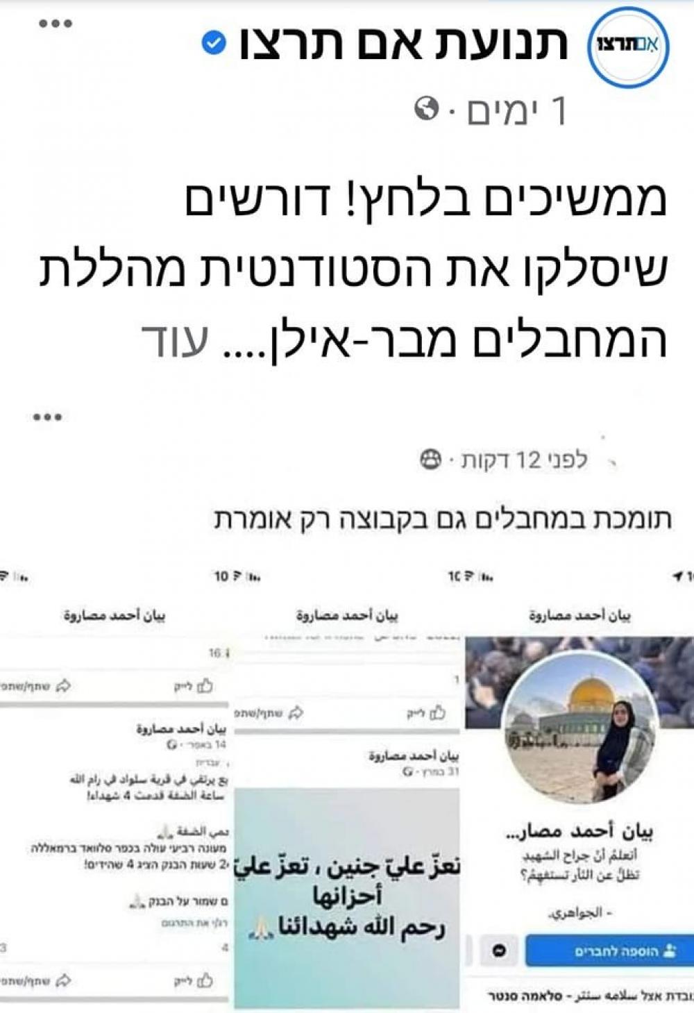 Asosiasi Zionis mengorganisasi kampanye pada Kamis (12/5) yang menyerukan pembunuhan mahasiswi Palestina, Bayan Maswarah dari Kafr Qara Palestina, karena publikasinya tentang kejahatan pendudukan dan peristiwa di Jenin, Tepi Barat. Seminggu yang lalu, Masawrah juga telah diancam oleh asosiasi permukiman. Sementara itu, Universitas Tel Aviv menerima surat dari asosiasi tersebut yang menyerukan untuk mengeluarkannya karena dia orang Palestina.