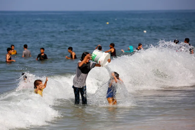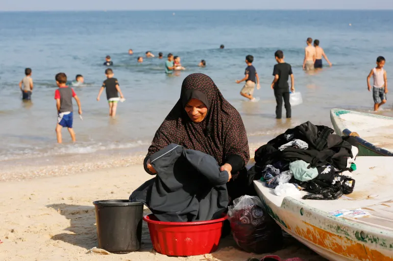 Andaleeb al-Zaq bersyukur atas laut dan angin yang berembus di sekitarnya. “Ini seperti rekreasi sejenak dari kekacauan di sekolah yang menampung kami,” kata pria berusia 48 tahun itu. “Anak-anak menganggap perjalanan kami ke tempat baru ini seperti piknik sekolah.”