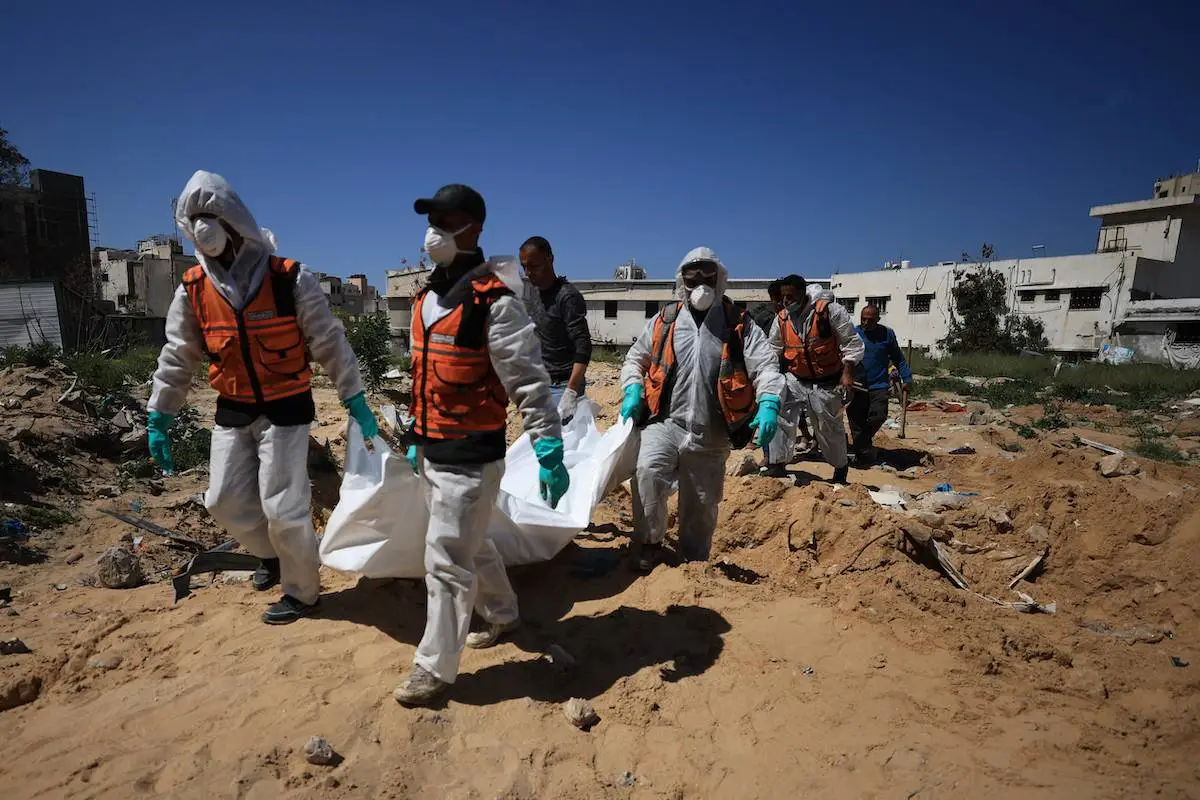 Sabtu (15/03), petugas Pertahanan Sipil Palestina terus berupaya untuk mengevakuasi jenazah 61 warga Palestina yang dikuburkan di halaman Rumah Sakit Al-Shifa, Gaza, selama agresi berbulan-bulan yang dilancarkan Israel.